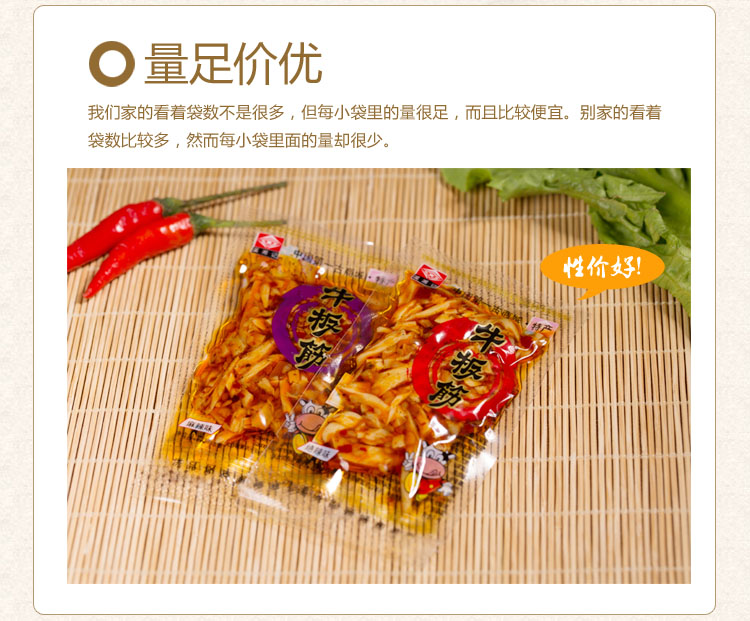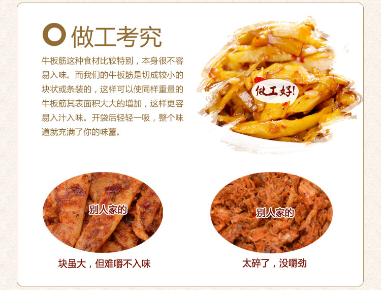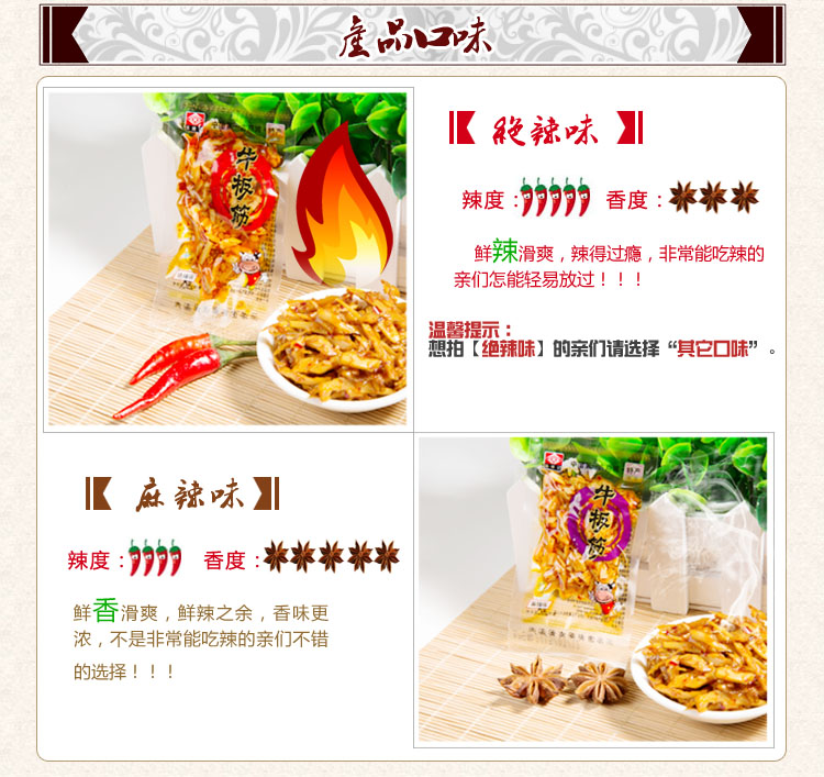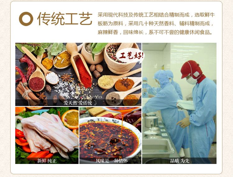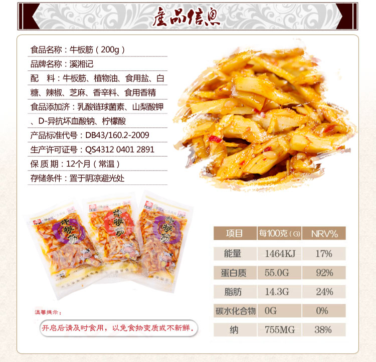 • 配料表:牛板筋、植物油、食用盐、白糖、辣椒、芝麻、香辛料、食用香精